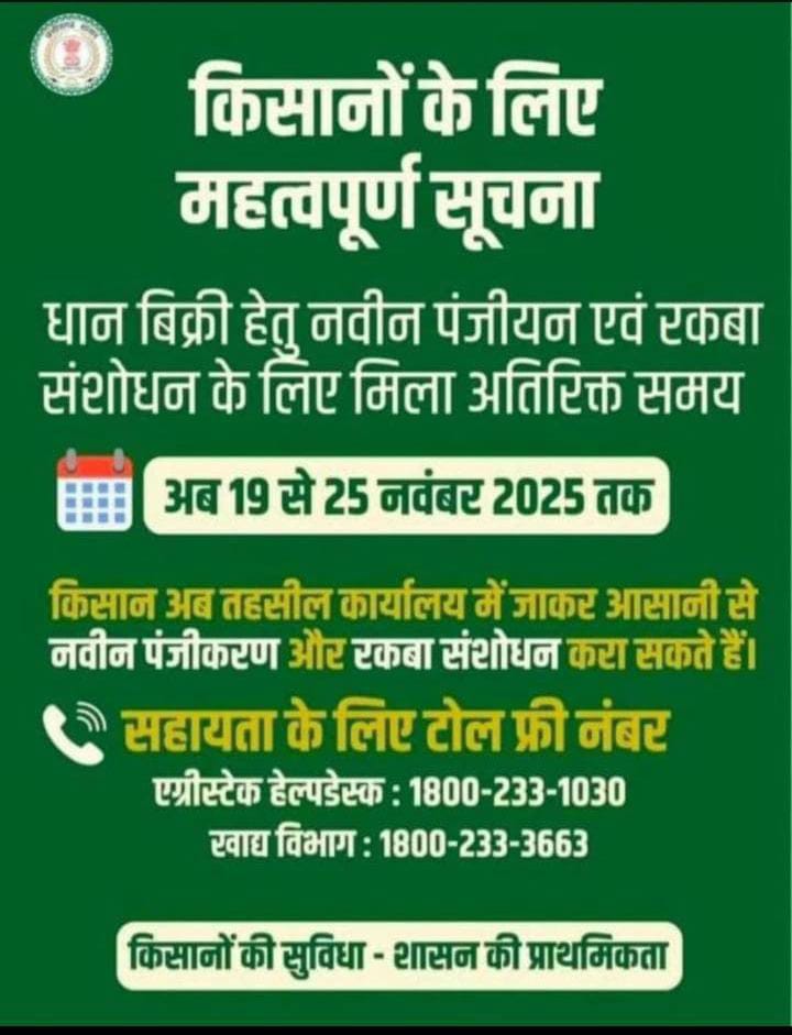 दुर्ग, 20 नवम्बर 2025/राज्य शासन ने किसानों की सुविधा को प्राथमिकता देते हुए धान खरीदी के लिए नवीन पंजीयन तथा रकबा संशोधन की अंतिम तिथि बढ़ा दी है। अब किसान 25 नवंबर 2025 तक अपने तहसील कार्यालय में जाकर आसानी से नवीन पंजीकरण एवं रकबा संशोधन करवा सकेंगे। जो किसान किसी कारण से निर्धारित समयसीमा में पंजीयन नहीं करा पाए थे, अतिरिक्त समय मिलने से अधिक से अधिक किसान आगामी धान खरीदी प्रक्रिया में सम्मिलित हो सकेंगे। किसानों की सहायता के लिए शासन ने टोल-फ्री हेल्पलाइन भी जारी की हैं। एग्रीस्टेक हेल्पडेस्क 1800-233-1030, खाद्य विभाग हेल्पलाइन 1800-233-3663 है।