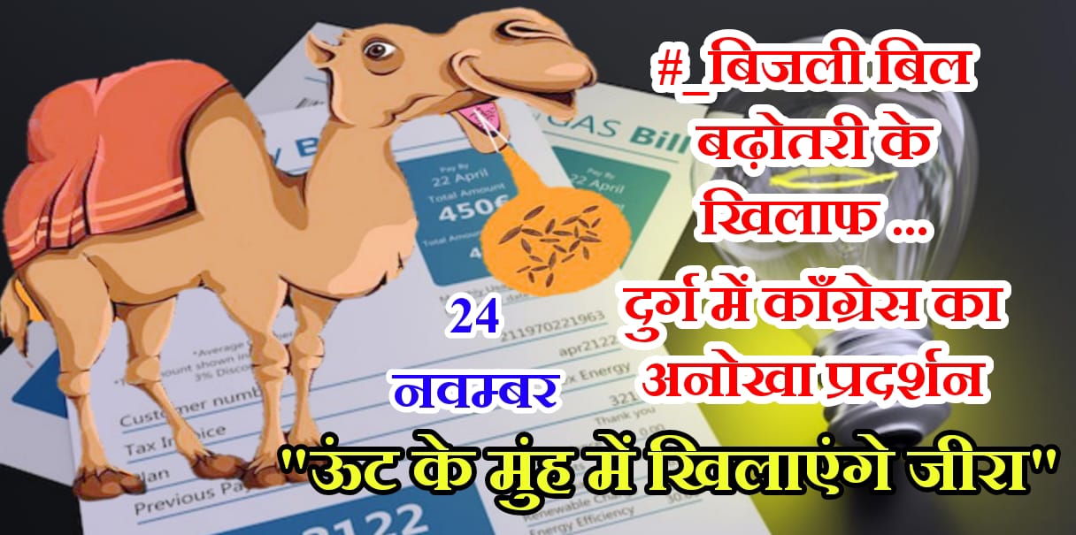 कांग्रेस जिलाध्यक्ष राकेश ठाकुर ने कहा कि पूर्व में कांग्रेस की श्री भूपेश बघेल जी की सरकार द्वारा लागू 400 यूनिट तक बिजली बिल में हाफ योजना को पुनः बहाल करने की मांग तथा भाजपा सरकार द्वारा बिजली बिल के नाम पर छत्तीसगढ की जनता के साथ किये जा रहे लगातार अन्याय के खिलाफ दिनांक 24.11. 2025 दिन- सोमवार को सुबह 11 बजे बिजली ऑफिस के सामने पटेल चौक दुर्ग में ऊंट के मुंह में जीरा खिला-कर प्रदेश की भाजपा सरकार के खिलाफ प्रदर्शन किया जाएगा।