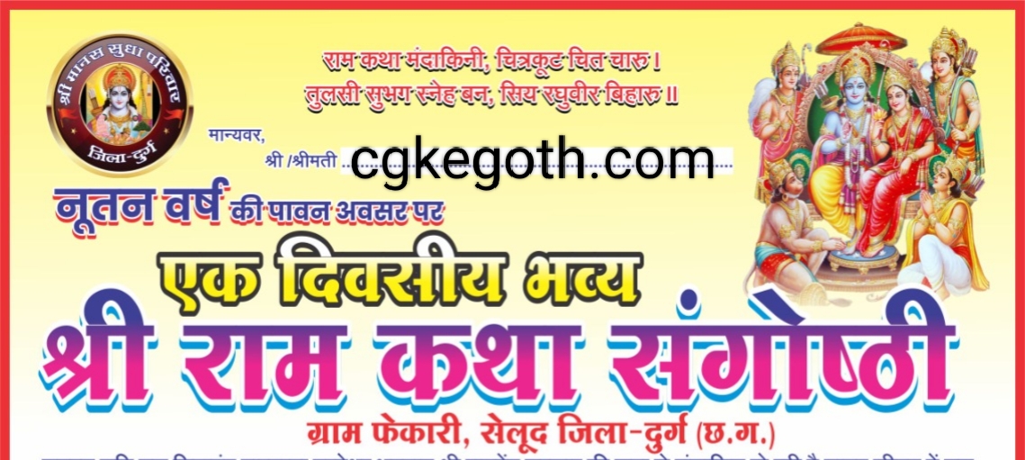 श्री राम कथा संगोष्ठी 2 जनवरी 2026 दिन शुक्रवार को आयोजित किया गया है। मंगल चरण प्रातः 10:00 बजे ज्योति मानस मंडली फेकारी के साथ कथा प्रारंभ होगी।जिसकी तैयारी आयोजक समिति के द्वारा किया जा रहा है। उक्त जानकारी अध्यक्ष योगेश साहू ने मीडिया को शेयर किया है।