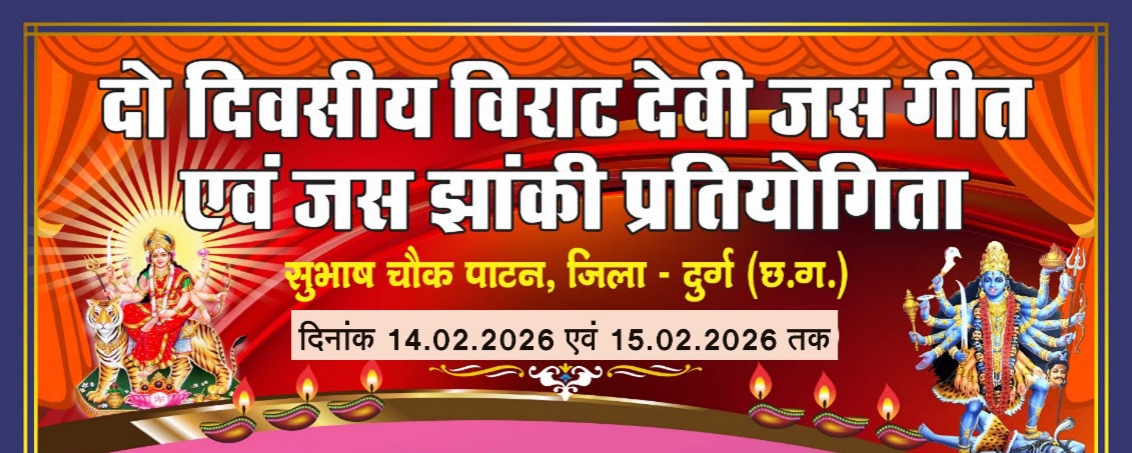 पाटन। नगर के ऐतिहासिक सुभाष चौक में कल दिनांक 14 एवं 15 फरवरी को भव्य विराट जसगीत झांकी प्रतियोगिता का आयोजन किया जाएगा। कार्यक्रम को लेकर तैयारियां लगभग पूर्ण हो चुकी हैं और आयोजन स्थल को आकर्षक सजावट से सजाया गया है।