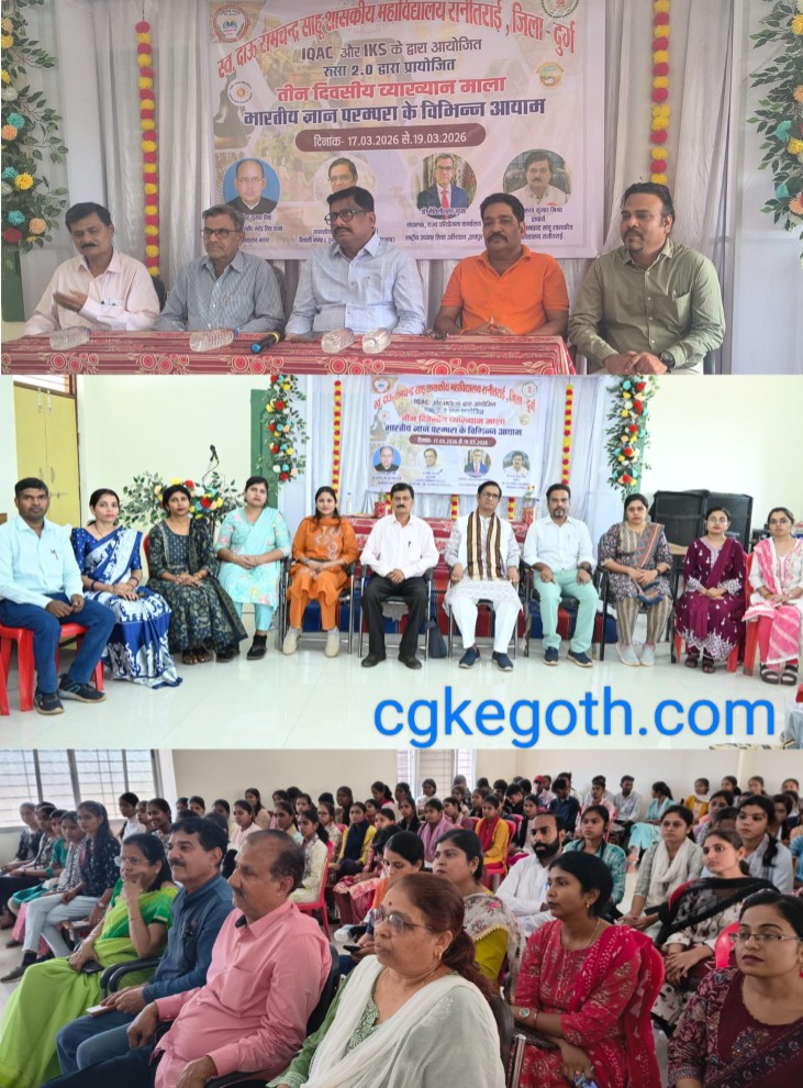 रानीतराई। स्व. दाऊ रामचंद्र साहू शासकीय महाविद्यालय, रानीतराई में “भारतीय ज्ञान परम्परा के विभिन्न आयाम”विषय पर तीन दिवसीय व्याख्यान माला का आयोजन प्राचार्य डॉ. अरुण कुमार मिश्रा के मार्गदर्शन में किया गया। IQAC प्रभारी एवं कार्यक्रम के संयोजक श्री चंदन गोस्वामी तथा IKS प्रभारी एवं सहसंयोजक श्रीमती अंबिका ठाकुर बर्मन के संयुक्त तत्वाधान में आयोजित एवं RUSA 2.0 द्वारा प्रायोजित यह व्याख्यान माला दिनांक 17/03/2026 से 19/03/2026 तक आयोजित की गई।