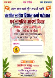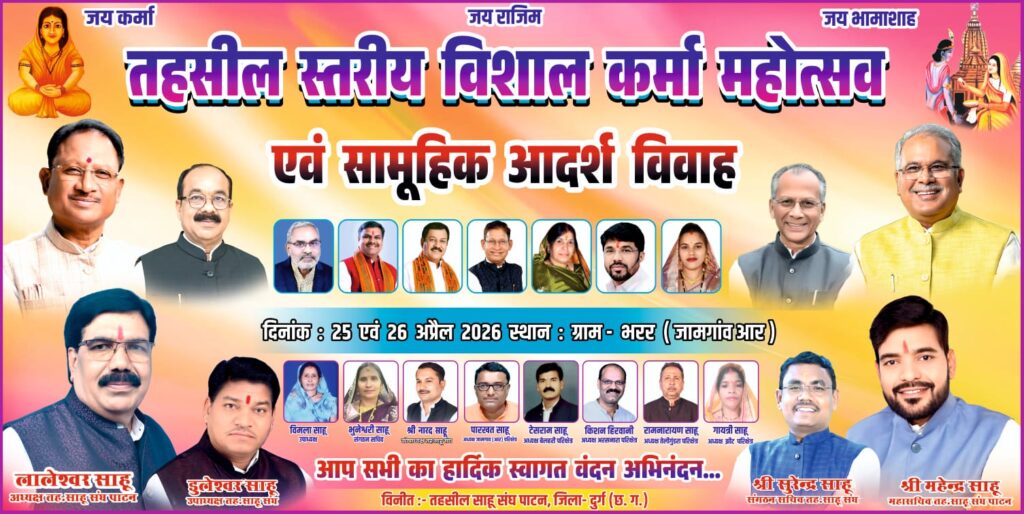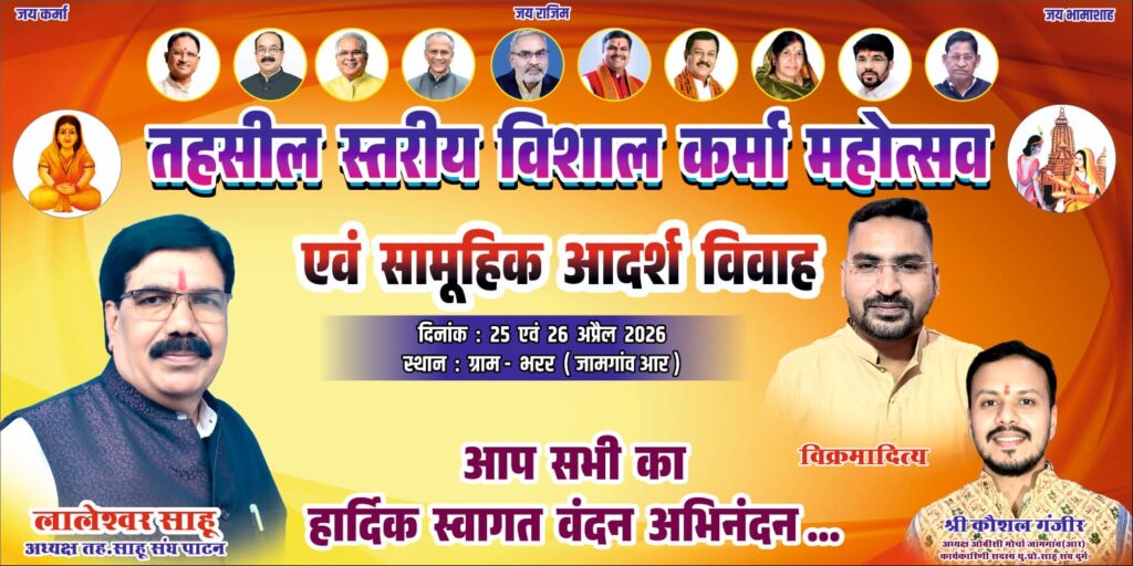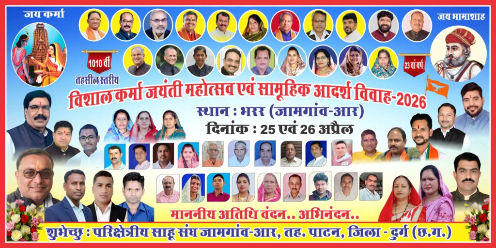 जामगांव आर। तहसील साहू संघ पाटन के तत्वावधान में साहू समाज की आराध्य देवी भक्त माता कर्मा की 1010वीं जयंती के पावन अवसर पर तहसील साहू संघ पाटन, परिक्षेत्रीय साहू संघ जामगांव आर एवं स्थानीय साहू समाज भरर के संयुक्त नेतृत्व में तहसील स्तरीय विशाल कर्मा महोत्सव, सामूहिक आदर्श विवाह एवं सामाजिक सम्मान समारोह (23वां वर्ष) का भव्य आयोजन किया जा रहा है। इस पुनीत अवसर पर सभी समाजजनों, परिवारजनों एवं इष्ट-मित्रों को सादर आमंत्रित किया गया है।