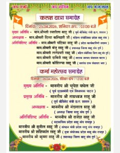 तहसील अध्यक्ष लालेश्वर साहू ने जानकारी देते हुए बताया कि यह आयोजन 25 एवं 26 अप्रैल 2026 (शनिवार एवं रविवार) को आयोजित होगा। 25 अप्रैल 2026 (शनिवार) को दोपहर 02:00 बजे 1010 सामाजिक महिलाओं के द्वारा भव्य कलश यात्रा का शुभांरभ होगा, शाम 04:00 बजे आरती, अतिथि स्वागत महिला सम्मेलन एवं चुलमाटी कार्यक्रम संपन्न होगा।