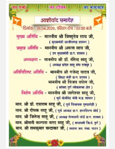 तहसील अध्यक्ष ने आगे कहा कि दोपहर 02:00 बजे बारात स्वागत किया जायेगा, लगभग 15 जोड़ा के सामुहिक विवाह की वैवाहिक संस्कार एवं पाणिग्रहण (महंत पंचम दास साहेब शास्त्री जी, परसोदा (डंगानिया) द्वारा) संपन्न होगा।