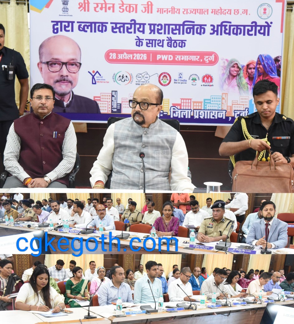 दुर्ग, 28 अप्रैल 2026/राज्यपाल श्री रमेन डेका ने आज लोक निर्माण विभाग के सभाकक्ष में जिले के ब्लॉक स्तरीय प्रशासनिक अधिकारियों की समीक्षा बैठक ली। इस दौरान राज्यपाल श्री डेका ने लोक निर्माण विभाग के प्रांगण में एक पेड़ मां के नाम के तहत वृक्षारोपण भी किया। राज्यपाल ने निर्देश दिए कि अधिकारी हितग्राहियों से व्यक्तिगत रूप से मिलें और विभिन्न सरकारी योजनाओं के क्रियान्वयन की वास्तविक स्थिति का फीडबैक ले। सभी योजनाओं का लाभ अंतिम व्यक्ति तक पहुंचे, इसके लिए निरंतर मॉनिटरिंग सुनिश्चित की जाए।